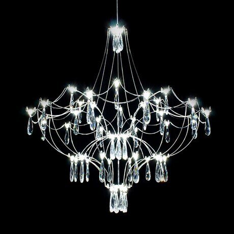 Люстра Mecano D70 хром Роскошная люстра Mecano очаровывает гармонией линий, легкостью форм, завораживает бликами света на граненых подвесках, вызывая ощущение праздника. Современная интерпретация классических подвесных светильников выглядит одновременно торжественной и воздушной. Создает изысканный акцент в классическом или современном интерьере. Сочетание кружевного каркаса из тонких прутков нержавеющей стали, декора из стекла или хрусталя со светодиодами смотрится актуально и удачно гармонирует с современными и классическими интерьерами. Материалом для подвесок служат стекло (прозрачное, дымчатое, радужное) или хрусталь. Подвесной светильник ручной работы можно заказать по индивидуальным размерам.Цоколь:LEDЦветовая температура:3000КДиммирование:нетКоличество светодиодов:51Световой поток, lm:3060Мощность, вт:26Степень защиты:IP20Крепление:Потолочная площадка; Цанговый подвесДлина тросов:150 см