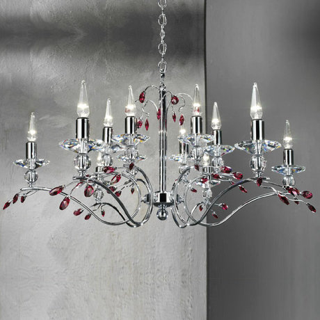 Люстра из коллекции SOIREE с металлической хромированной арматурой. Чашки из прозрачного хрусталя, листочки из красного хрусталя SWAROVSKI®STRASS. Дизайн Lanciotto e Andrea Galeotti. Количество лампочек: 12. Мощность: 12 x 40 Вт. Тип лампы: Галогенная, E14.
